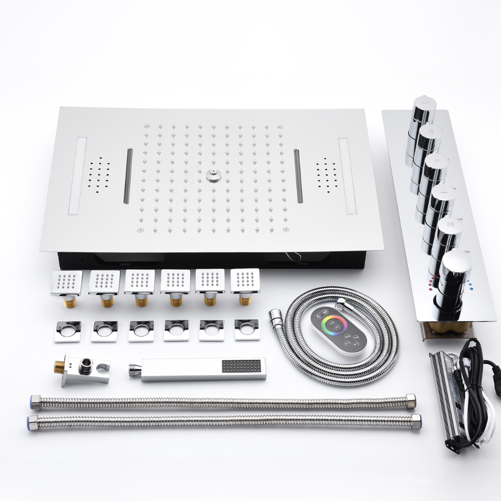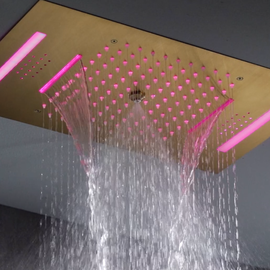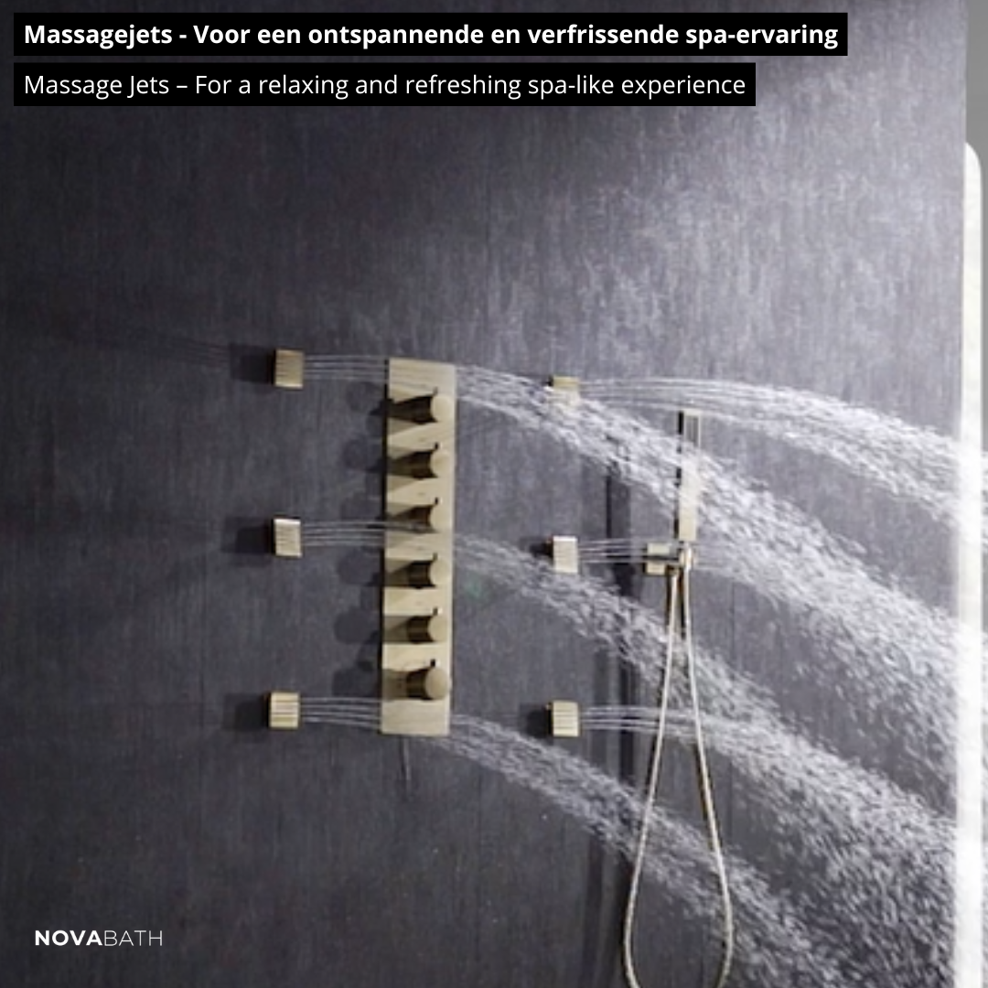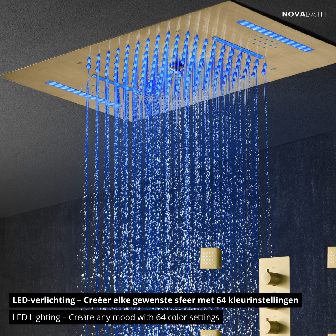 5-in-1 Thermostatische Inbouw Regendoucheset Julia – Bluetooth & Speakers – LED Verlichting – Massagejets - Brushed gold